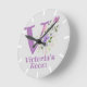 El diseño presenta Monograma y Nombre con Flores a cada lado en un color pastel de agua. El nombre de ejemplo es Victoria. Reloj de dormitorio para niños. Cambie el nombre como desee para cualquier persona con un nombre que empiece por V.