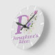 Reloj de dormitorio para niños. El diseño presenta Monograma y Nombre con Flores a cada lado en un color pastel de agua. El nombre de ejemplo es Persephone. Reloj de dormitorio para niños. Cambie el nombre como desee para cualquiera con un nombre que comience por P.