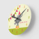 Un reloj con un ilustracion de un elefante de circo parado en una plataforma con un gorra rosado. Personalice su nombre en la parte inferior derecha del elefante.