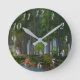 Una mesa de árboles en un soleado día de verano. Los árboles altos son altos y oscuros, pero los saplings de abajo tienen un nuevo y brillante crecimiento. Crecer a través de las hojas caídas es el verde, el rosa y el blanco del trébol y otras cubiertas de tierra.
