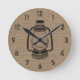 Reloj con un ilustracion negro de una lámpara de aceite de estilo camping sobre un fondo inspirado en una burlap.