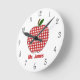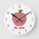 Un reloj para los profesores con un ilustracion de una manzana de gingham roja. Personaliza con el nombre de tu profesor en rojo.