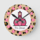 Un reloj que ofrece un diseño del estampado leopardo y el logotipo de la escuela rosada. Personalice con su nombre debajo de escuela. Registre los números blancos de las características en puntos rosados.