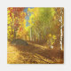 Un camino sobrepoblado serpentea por el bosque de abedules en un día soleado de otoño. Los troncos blancos y negros de los árboles contrastan con las hojas y el césped en todos los tonos de oro, desde el amarillo pálido hasta el naranja profundo, iluminados por los rayos solares que recorren las ramas.