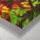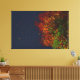 Mirando hacia arriba a través de las ramas de un árbol que se alza en otoño. Las hojas que caen de burdeos, rojos, dorados, naranjas, amarillos y azules brillan contra el cielo azul profundo.