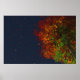 Mirando hacia arriba a través de las ramas de un árbol que se alza en otoño. Las hojas que caen de burdeos, rojos, dorados, naranjas, amarillos y azules brillan contra el cielo azul profundo.