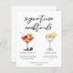 Este menú de cócteles, refrescante y afrutado, incluye una tipografía negra sencilla sobre 2 bebidas y sus ingredientes para el bar boda. Un bonito dibujo de Cherry French 75 y Lemon Drop añade un toque fresco a su menú de bar. Con los nombres de la pareja y la fecha de recepción.
