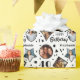 Personalizar el nombre en este papel de envoltura de fotos para el niño de 40 años en tu vida. Las formas de confetti conforman 5 fotos en un collage con estrellas, cuadrados, rectángulos y triángulos de papel envolvente de 40 años. El confeti y la tipografía están en blanco y negro. Así que tus fotos serán el foco.