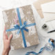 Conejo de liebre blanca rodeado de nieve en la envoltura de regalo de papel Kraft.