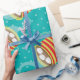¡Colorido, diversión, y papel de embalaje de mirada delicioso del día de fiesta del navidad ofrece un fondo azul bonito con los lunares, las tazas rayadas de cacao caliente con las melcochas, y las galletas de microprocesador de chocolate!