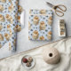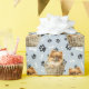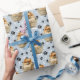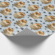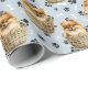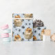 Un adorable cachorro pomerano asomando desde una cesta de mimbre es la característica del patrón en este papel de envoltura de regalo de ocasión. El retrato es en medio de un patrón de huellas de pata negra y huesos blancos, y se repite en un fondo azul plateado. ¡Perfecto para cualquier amante de los perros Pomerania!