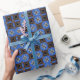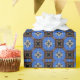 Este patrón brillante presenta un fondo azul brillante con cuadrados marrones y azul marino. Cada cuadrado tiene un diseño en forma de estrella.