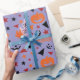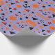 La "Calabaza, Estrellas y Papel de envolver sin hojas" presenta calabazas enclavadas en hojas de otoño con brillantes estrellas y espeluznantes palabras de Halloween, perfectas para regalos con temática de Halloween.