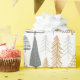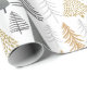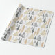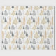 El papel de envolvimiento de las vacaciones CLARA presenta tonos dorados y azules sobre árboles navideños modernos