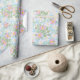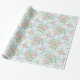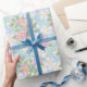 Un rollo de bonito Giftwrap, con un patrón bonito, nostálgico de Dogroses rosados sobre un fondo azul cielo. Parte de la colección Posada Rosy y Pintorly.