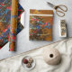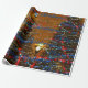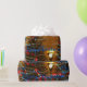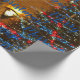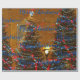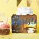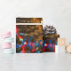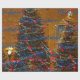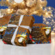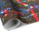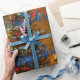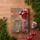 Feliz Navidad, elegante tipografía azul, con unos alegres árboles de Navidad delante de un edificio con luces de pared que repiten diseño de patrón para su alegría festiva.