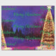 Feliz Navidad, elegante tipografía verde con brillantes árboles de navidad afuera y hermoso fondo nocturno, con varios árboles, cielo azul profundo y iluminación violeta repetiendo diseño de patrón para tu alegría festiva.