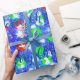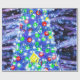 Feliz Navidad, elegante tipografía azul, con un vibrante árbol de Navidad con ornamentos verdes, rojos y amarillos y un colorido y nevado fondo de cielo nocturno repetiendo diseño de patrón para tu alegría festiva.