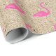 Flamencos rosa bonito sobre un fondo de arena de playa decoran este papel de envoltura de fiesta tropical, lo que lo hace perfecto para un cumpleaños, ducha o cualquier ocasión especial de verano.