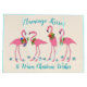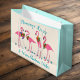 Navidades de flamingo tropical bolsa de regalo de papel de gran tamaño con dos lugares para añadir texto personalizado. La muestra que dice es "Besos flamencos y cálidos deseos de Navidades" en azul acuático sobre beige. Cuatro flamencos festivos se alinean entre las estrellas de mar azul y llevan coronas de vacaciones. El diseño y el dicho están impresos en ambos lados. El resto de la bolsa es de color azul claro.