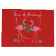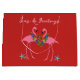 Navidades de flamencos de "mares y saludos" tropical bolso de regalo de papel de gran tamaño. Color rojo de vacaciones con pájaros rosados usando coronas festivas y parados entre estrellas de mar. La pareja flamingo está impresa en ambos lados sobre un sólido color rojo feriado.