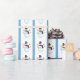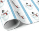 Este papel de envoltura presenta a los hombres de nieve alegres sosteniendo adornos navideños con copos de nieve. El fondo del papel tiene una banda azul de coordinación.