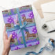 Caballo con el gorra púrpura y los globos púrpuras al lado de una cerca con un lazo. El cumpleaños o el otro papel de envoltorio para regalos de la ocasión.