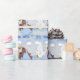 Este muchachos gemelos lindos - el papel de embalaje de la cigüeña B Baby Shower ofrece un fondo azul y blanco de la pendiente, nubes y una cigüeña que lleva a bebés gemelos americanos negros. Los bebés tienen pelo oscuro y pacificadores en una manta azul con los lunares blancos. El texto estilizado es él es muchachos gemelos. Perfeccione para envolver los regalos de Baby Shower. Elija sus medios y tamaño del papel de embalaje.