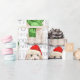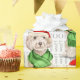 Un coqueto Cockapoo de Champagne se sienta con una bonita bufanda verde de invierno y un sombrero de Santa Claus rojo listo para desear a cualquier amante de los perros o amante de las mascotas unas felices vacaciones.