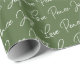 Navidades modernos envueltos en papel con un fondo verde con el dicho festivo "amor por la paz alegría" esparcidos a través de él.