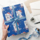 Perro Husky con Navidades de Santa Claus gorra sobre fondo azul y copos de nieve. Se puede cambiar el color de fondo.