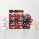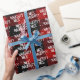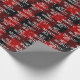 Texto blanco NICE NAUGHTY con copos de nieve sobre un fondo rojo y negro de manto de búfalo. El texto es editable.