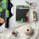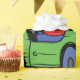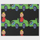 Niño en un coche verde vestido con una tapa roja sobre un papel de envolver