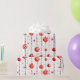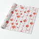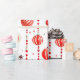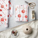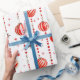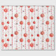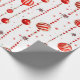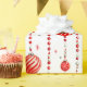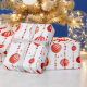 Este papel de envoltura presenta un patrón repetido de adornos de Navidad rojos y blancos colgados de cadenas verticales de cuentas rojas. También hay pequeñas estrellas rojas estilizadas diseminadas por el fondo blanco. Algunos adornos son rojos sólidos, mientras que otros tienen rayas rojas y blancas.