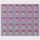 Un papel de envoltura azul-gris con el patrón de un bonito gnomo personalizado rojo . La palabra "amor" también está escrita en letras grandes.