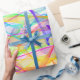 Como cintas ondulantes en verde neón y púrpura; blues y agua eléctricos; rosados calientes y rojos; naranjas fluorescentes y amarillos; todo transparente, retorcido y superpuesto en un patrón que recuerda a vigas de láser multicolor. Este impresionante diseño es una excelente elección para cumpleaños o para una presentación de regalos de anfitrión/anfitriona en Nochevieja.