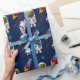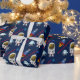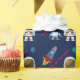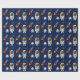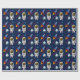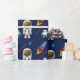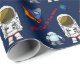 Papel de envoltura con temática espacial, hecho en azul oscuro, con coloridos gráficos de estilo personalizado de un barco espacial, robot, astronauta y el planeta tierra en el fondo. Personalice el texto rojo corriendo diagonalmente para el niño de cumpleaños.