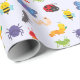 Este papel de envoltura de cumpleaños de insectos es divertido y colorido, con un fiesta de insectos que incluye una abeja linda, araña púrpura, oruga, hormiga, mariposa y caracol - todos celebrando el cumpleaños de tu hijo. ¡Tanto a los chicas como a los chicos les encantarán estos personajes de insectos!