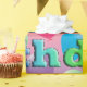 Globos coloridos sobre un fondo de degradado colorido con Feliz cumpleaños en texto de arco iris.