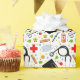Envoltura de regalo creativa para médicos para la celebración de la graduación de la escuela de medicina que incluye suministros de salud y gorros de graduación.