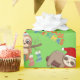 Navidades de perritas envolviendo papel, mostrando manchas cómicas en gorras Navidades esperando que Santa llegue con sus regalos.