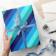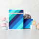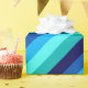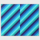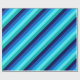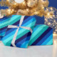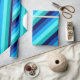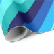 Un rollo de papel de envoltura con un diseño de patrón fresco de rayas diagonales en azul marino, azul cobalto, azul celeste, verde azulado de menta helada y turquesa claro.