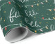Este es un rollo de papel de envoltura vacacional en el clásico verde de pino de invierno con luces de cuerda modernas y festivas y diseño de patrones de escritura "fa la la".