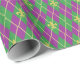 Un patrón de arlequín de verde y púrpura se transforma en un estilo lúdico con una superposición de contornos de diamante dorado y fleur de lis, creando un patrón divertido y colorido perfecto para cualquier celebración del Mardi Gras influenciada por Nueva Orleans.