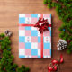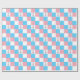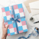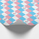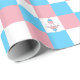 Papel de envolvimiento brillante con el símbolo fleur-de-lis (flor fleur-de-lys o flor de lirio) con rayas arcoiris de color rosa, azul y blanco de la bandera transgénero; diseño de orgullo trans en un patrón a cuadros