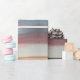Imagen en baldosas de nubes rosas y grises al atardecer. El cielo amarillo pálido y azul está salpicado de nubes. La imagen está enlosada con un patrón de espejo, formando un efecto caleidoscópico. Esto crea un efecto tranquilizador y sereno.