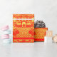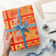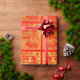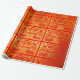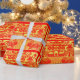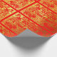 Papel rojo chino cortado con dos conejos y casa tradicional china + linternas y deseos de Feliz Año Nuevo + papel de textura dorado (imagen impresa) como fondo. Diseño en papel de envoltura.