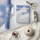 Este papel de embalaje ofrece las nubes mullidas blancas ondeantes en un cielo azul hermoso. Hace un gran papel de tablón de anuncios.