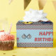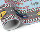 Presente su regalo de cumpleaños en este papel de embalaje temático que compite con festivo. Las características del diseño un modelo con competir con de coches de carreras abajo de pistas, un modelo blanco y negro del tablero de damas, tablero de damas de la repetición señalan por medio de una bandera y las palabras, "feliz cumpleaños!" compuesto tipo en rojo contra un fondo azul.