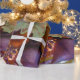 Papel de embalaje del navidad en púrpuras, blanco y oro elegantes
